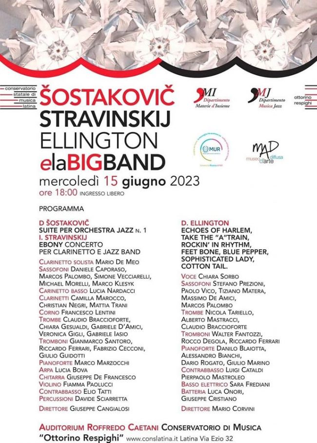 Jazz Orchestra “Sostakovic, Stravinskyj, Ellington” @ Auditorium Roffredo Caetani Conservatory of Latina By Alessandro Costantino BianchiJanuary 10, 2024Date: June 15, 2023Time: 6:00 pm - 8:00 pmLocation: Auditorium Roffredo Caetani-Conservatory of Latina